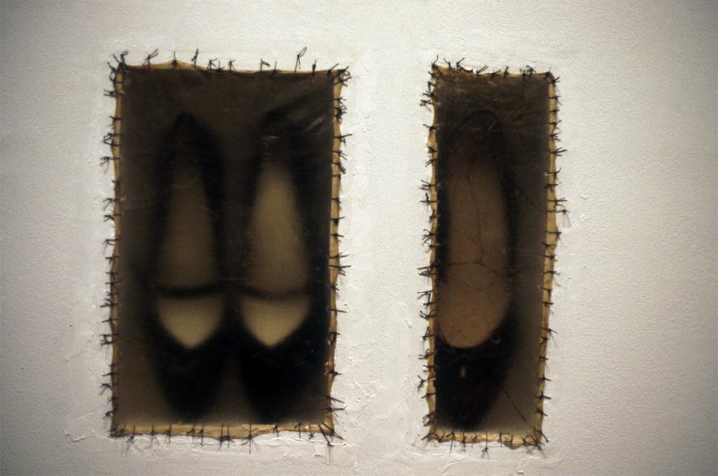 Doris Salcedo; Atrabiliarios; 1992-3; three shoes, plywood, cow bladder and surgical thread; 11.5 x 13.5 inches