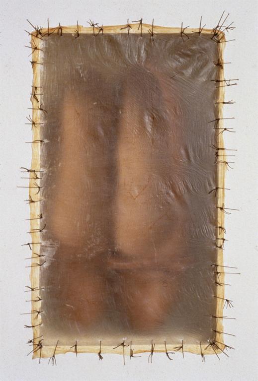 Doris Salcedo; Atrabiliarios; 1993; plywood, two shoes, cow bladder, surgical thread