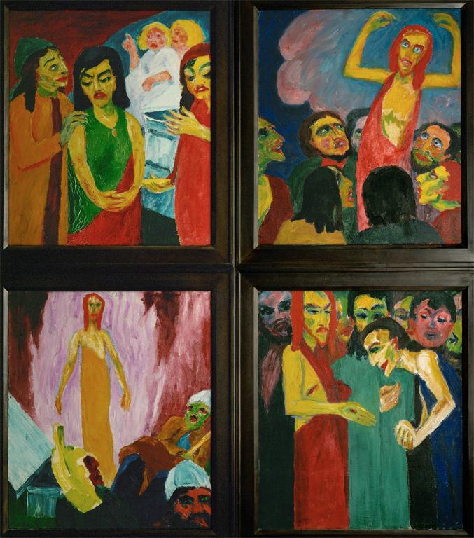Emil Nolde; Life of Christ Tripdtych: detail showing the right wing with, clockwise from the upper left: the Women at the Tomb; the Ascension; the Doubting Thomas; and the Resurrection; 1911-2; oil on canvas; each panel – 100 x 86 cm; Stiftung Seebüll Ada und Emil Nolde