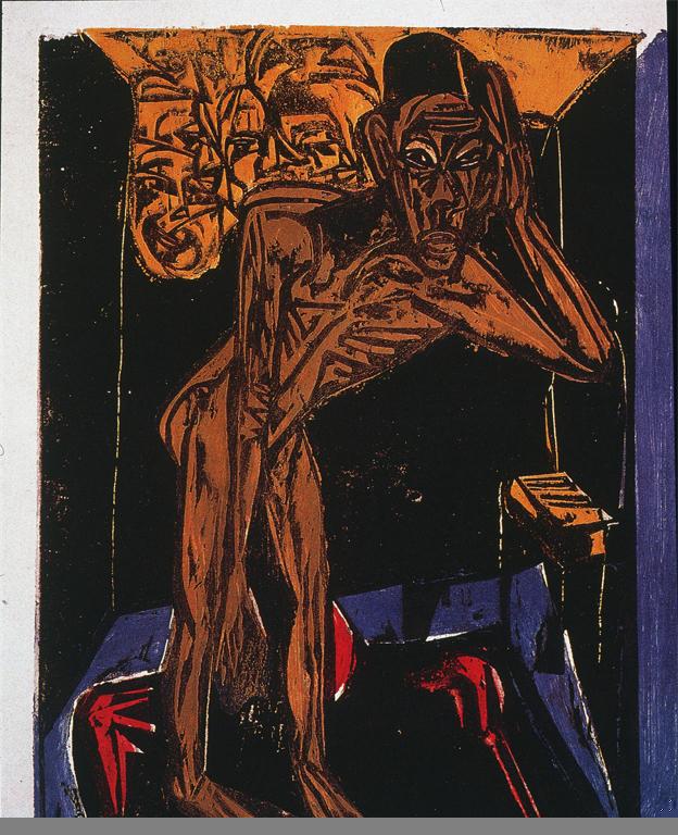 Ernst Ludwig Kirchner; Schlemihl in the Loneliness of His Room; 1915; color woodcut on paper; 33.5 x 23.7 cm
