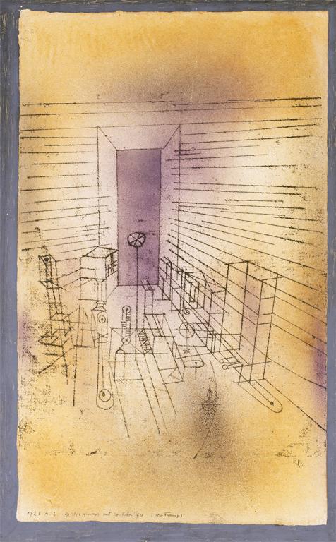Ghost Chamber with the Tall Door (New Version) Date 1925 Material Sprayed and brushed watercolor, and transferred printing ink on paper, bordered with gouache and ink Measurements H. 19-1/8, W. 11-5/8 inches (48.7 x 29.4 cm.)