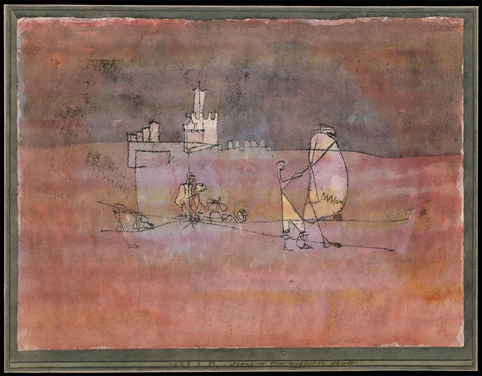 Episode Before an Arab Town; [Szene vor einer arabischen Stadt] Date 1923 Material Watercolor and transferred printing ink on paper, bordered with gouache and ink Measurements H. 8-7/8, W. 12 inches (22.5 x 30.5 cm.)