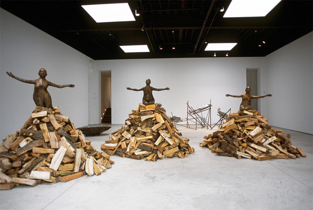Kiki Smith; Pyre Woman Kneeling, Pyre Woman on Haunches, Pyre Woman with Knees Extended; 2002; bronze and wood; left to right: 37″ x 61″ x 33″, figure 91″ x 124″ diameter with base dimensions variable; 37″ x 62 1/2″ x 28″, 100″ x 124″ diameter with base dimensions variable; 2″ x 39″ x 35″, 119″ x 124″ diameter with base dimensions variable