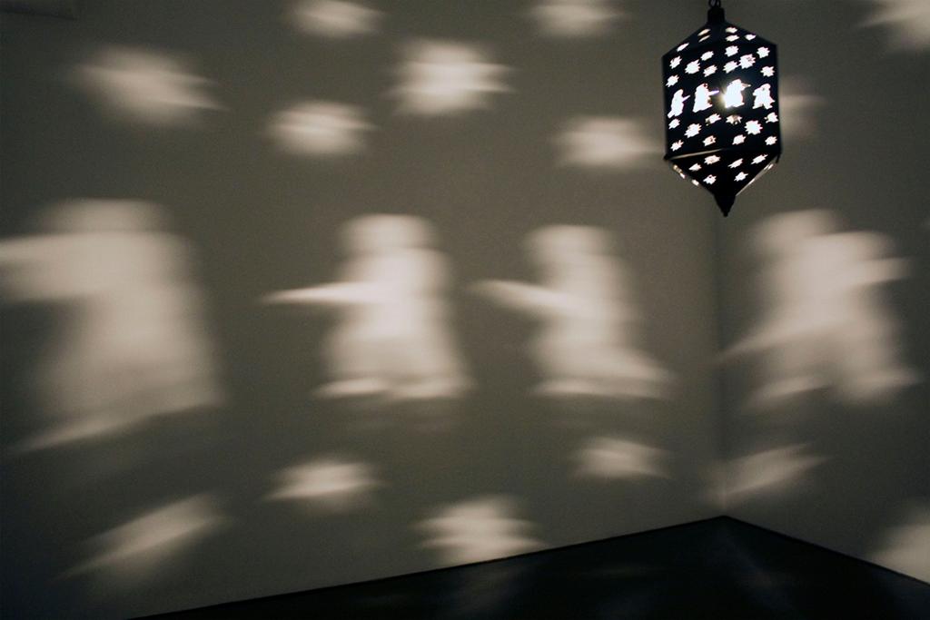 Mona Hatoum; Mizbah; 2006-7; brass lantern, metal chain, light bulb, and rotating electric motor