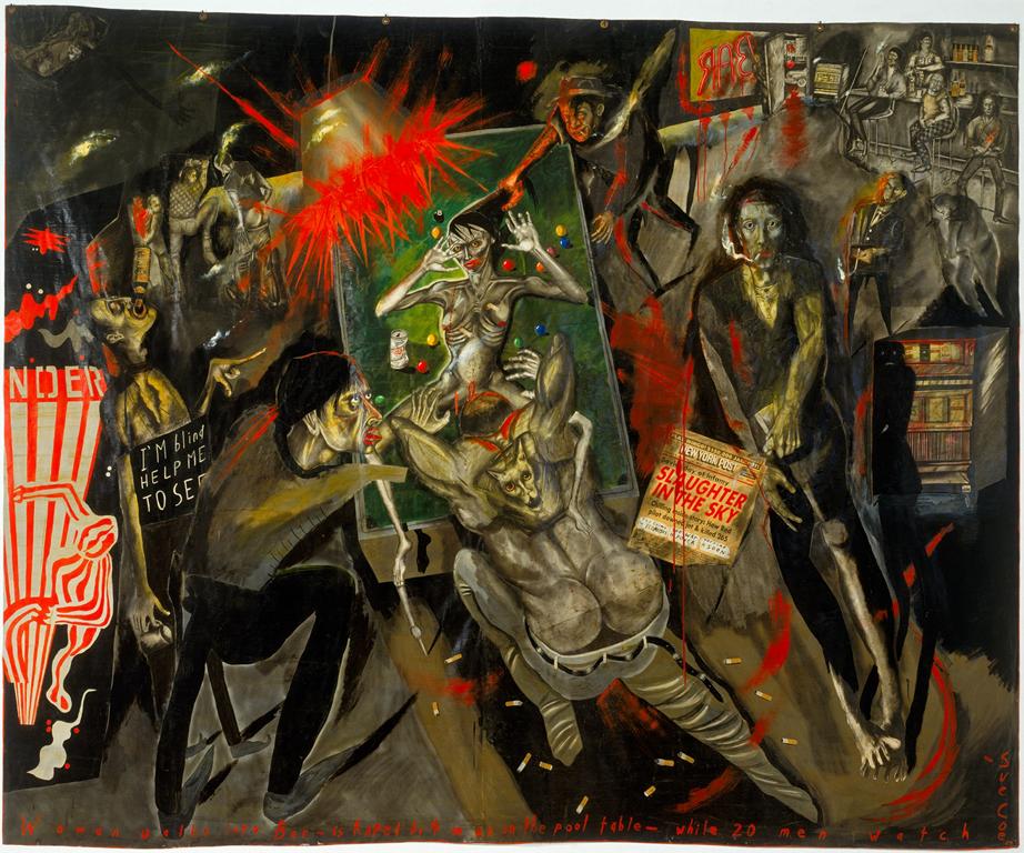 Sue Coe; Woman Walks into Bar – Is Raped by Four Men on the Pool Table – While 20 Watch; 1983; mixed media; 232.7 x 287.7 cm; The Museum of Modern Art
