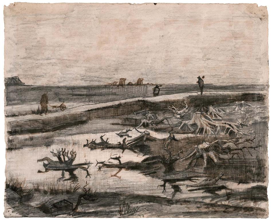 Vincent van Gogh, Landscape with Bog Trunks (Travaux aux Champs), Graphite pencil with pen and brown ink on paper, 34.3 x 42.4 cm (13 1/2 x 16 11/16 in.), 1883.