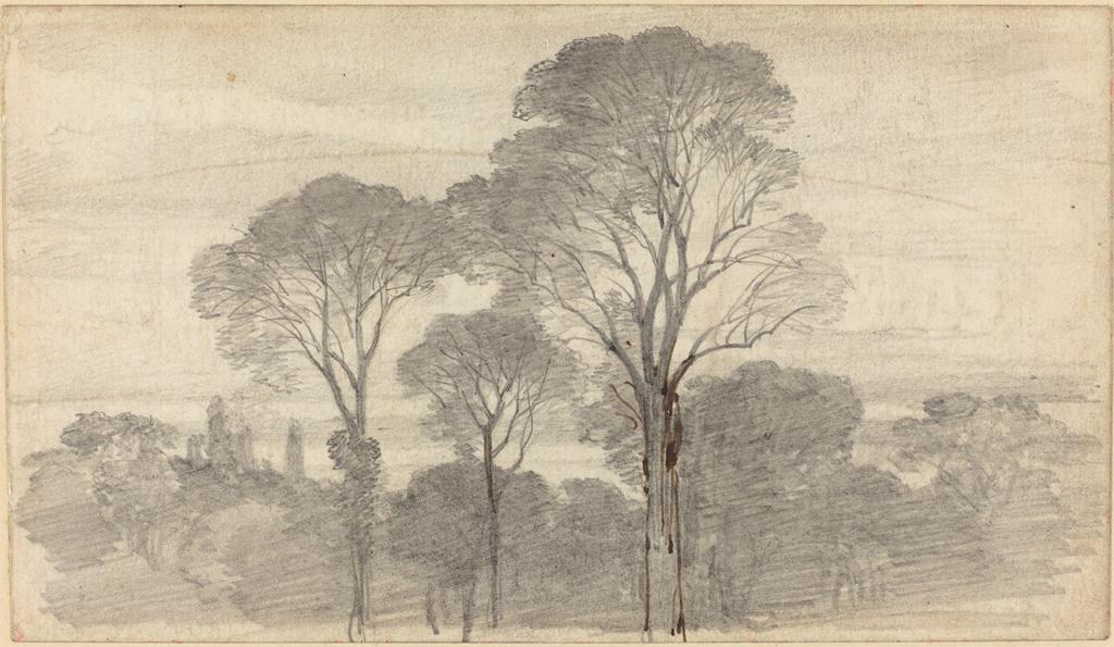 Myles Birket Foster, An Evening Landscape with Tall Trees, graphite with touches of pen and brown ink on wove paper, 8.7 x 15 cm (3 7/16 x 5 7/8 in.); mount: 16 x 17.5 cm (6 5/16 x 6 7/8 in.), c. 1825 – 1899.