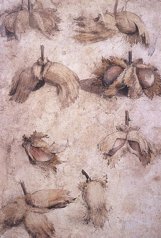 Giovanni, da Udine. Studies of Nuts, brush and wash, watercolor over traces of black chalk, 268 x 180 mm, 16th C.