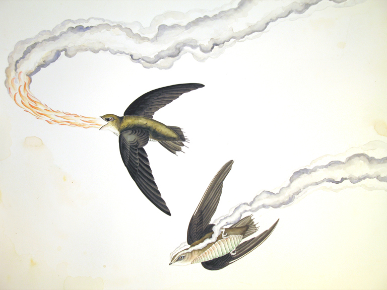 Justin Gibbens Bird of Paradise XVI- Fire-breathing Chimney Swift Watercolor, graphite, gouache, oolong tea on paper 2008 23″ x 30″