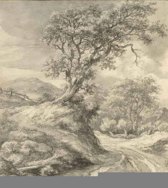 Jacob van Ruisdael; Dune Landscape with Oak Tree; 1650-5; black chalk, brush and gray wash, gouache; 21 x 19.1 cm; The Metropolitan Museum of Art