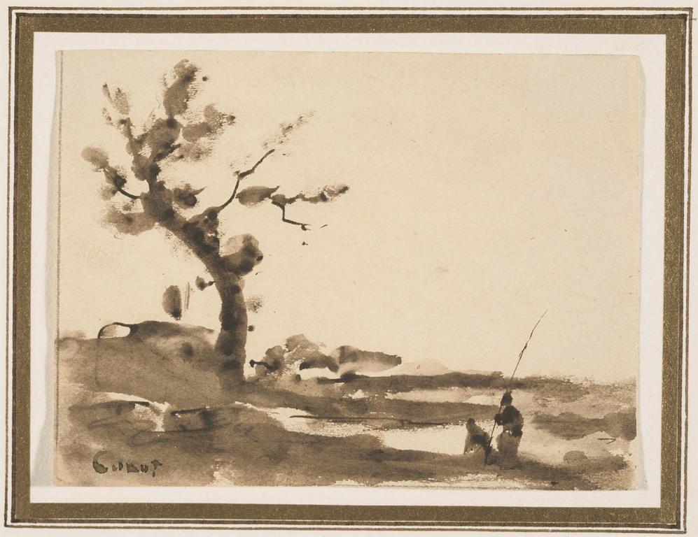 Jean-Baptiste Camille Corot; Landscape, with large tree on left, two figures at right, one holding long pole; 1860s; brush and brown wash on beige wove paper; 7 x 9.5 cm; Museum of Fine Arts, Boston