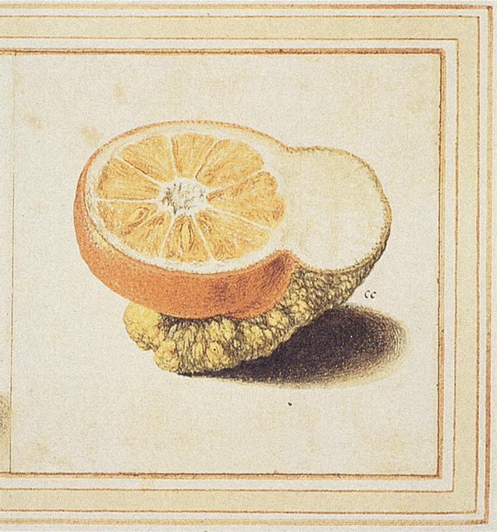 Vincenzo Leonardi; Citron and sour orange, Citrus medica L. and Citrus aurantium L.: chimeric half-fruit; watercolor and bodycolor, with gum heightening, over black chalk and incised lines; 129 x 130 mm; Windsor Castle, Royal Library, UK