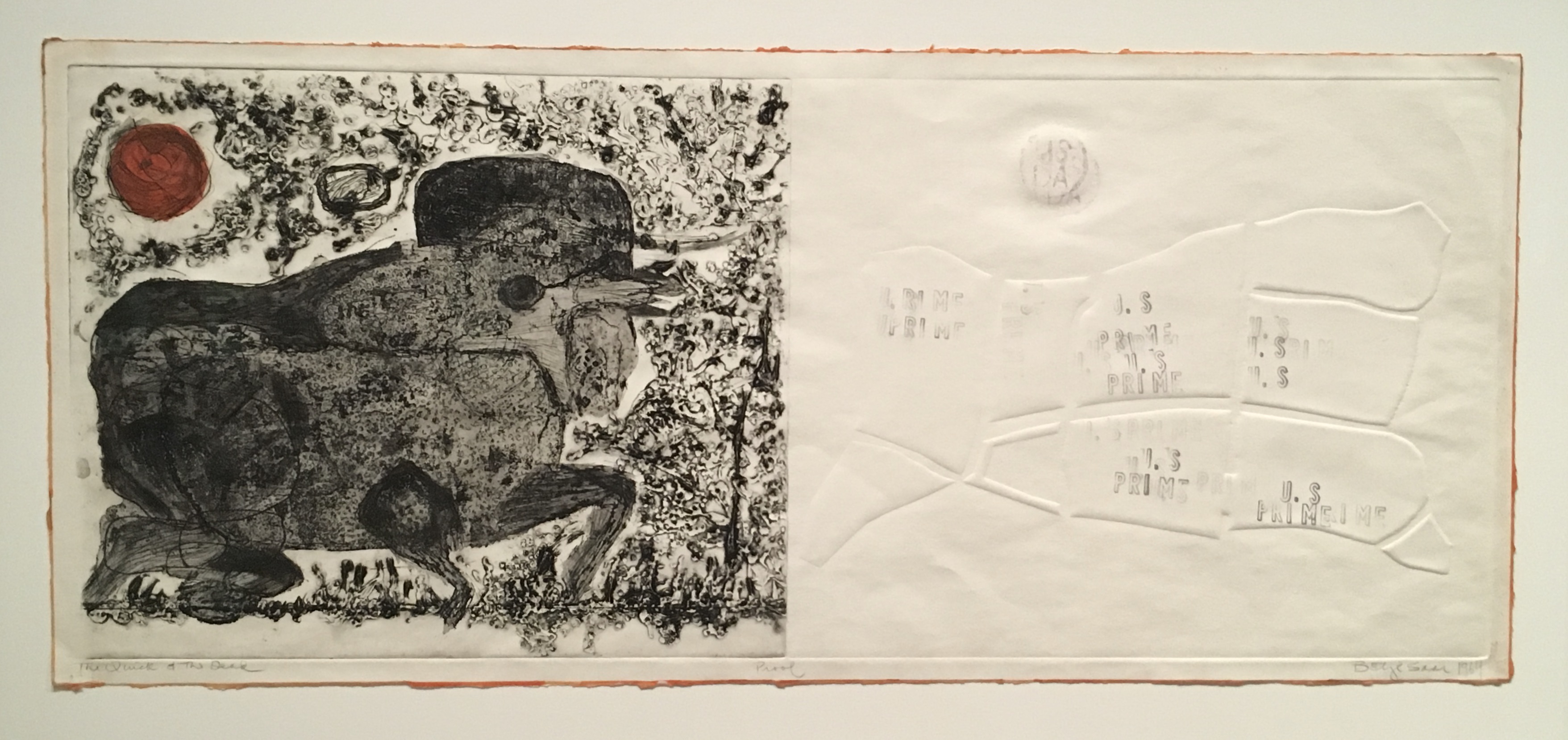Betye Saar, Black Angus Meets Big Brahma, etching with relief-printed found object, 1964