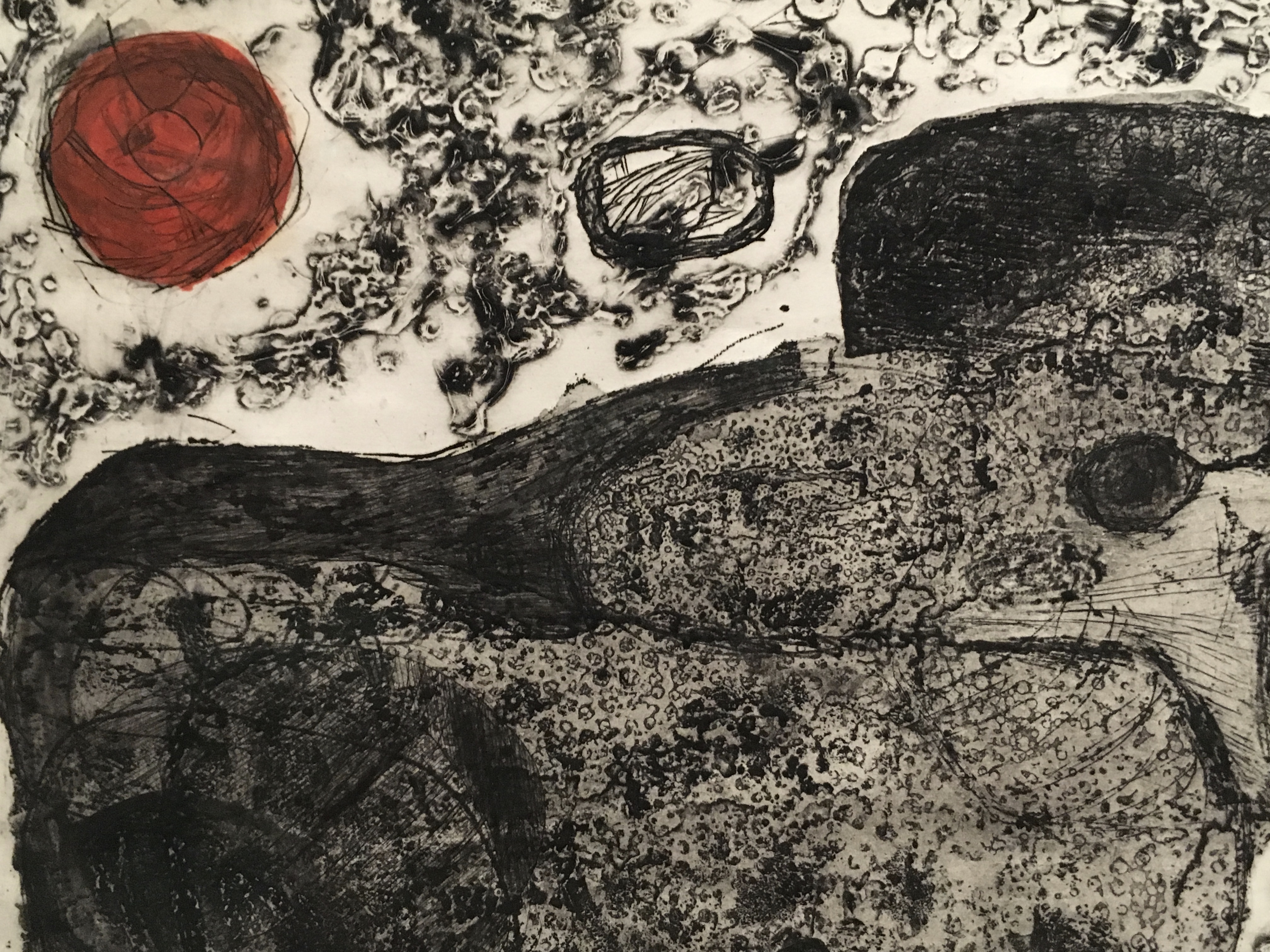 Betye Saar, (detail) Black Angus Meets Big Brahma, etching with relief-printed found object, 1964