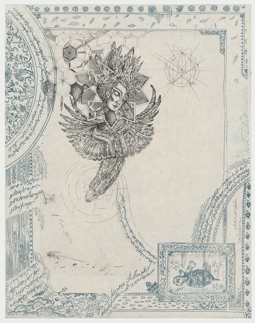 Golbanou Moghaddas Hoopoe The Heroine, 2019 Multi-plate etching and chine collé Sheet: 28 x 22 inches Golbanou Moghaddas Hoopoe The Heroine, 2019 Multi-plate etching and chine collé Sheet: 28 x 22 inches