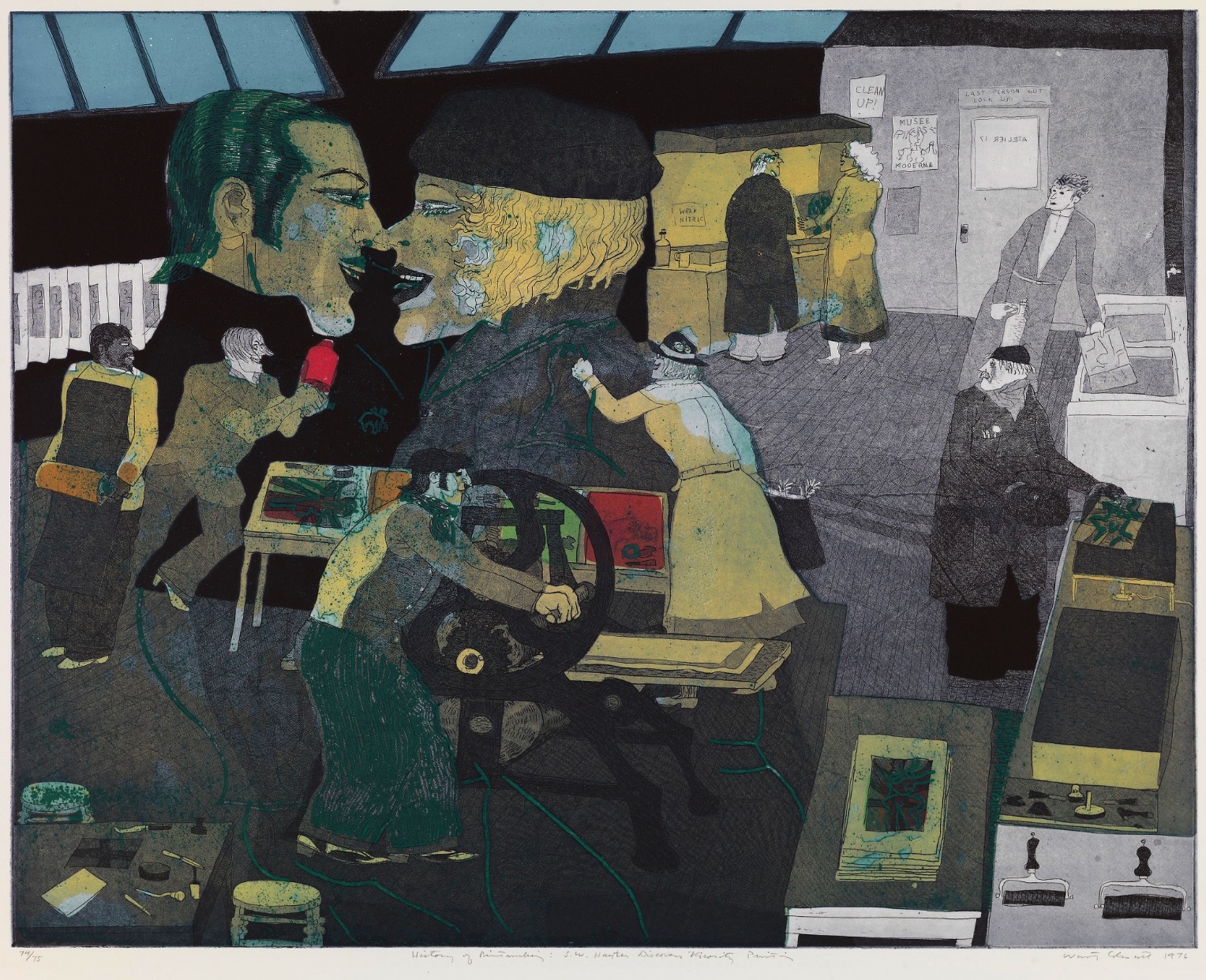 Warrington Colescott, Hayter Discovers Viscosity Printing, from the series A History of Printmaking, 1976, color intaglio on paper, plate: 21 7/8 x 27 3/4 in. (55.5 x 70.5 cm).