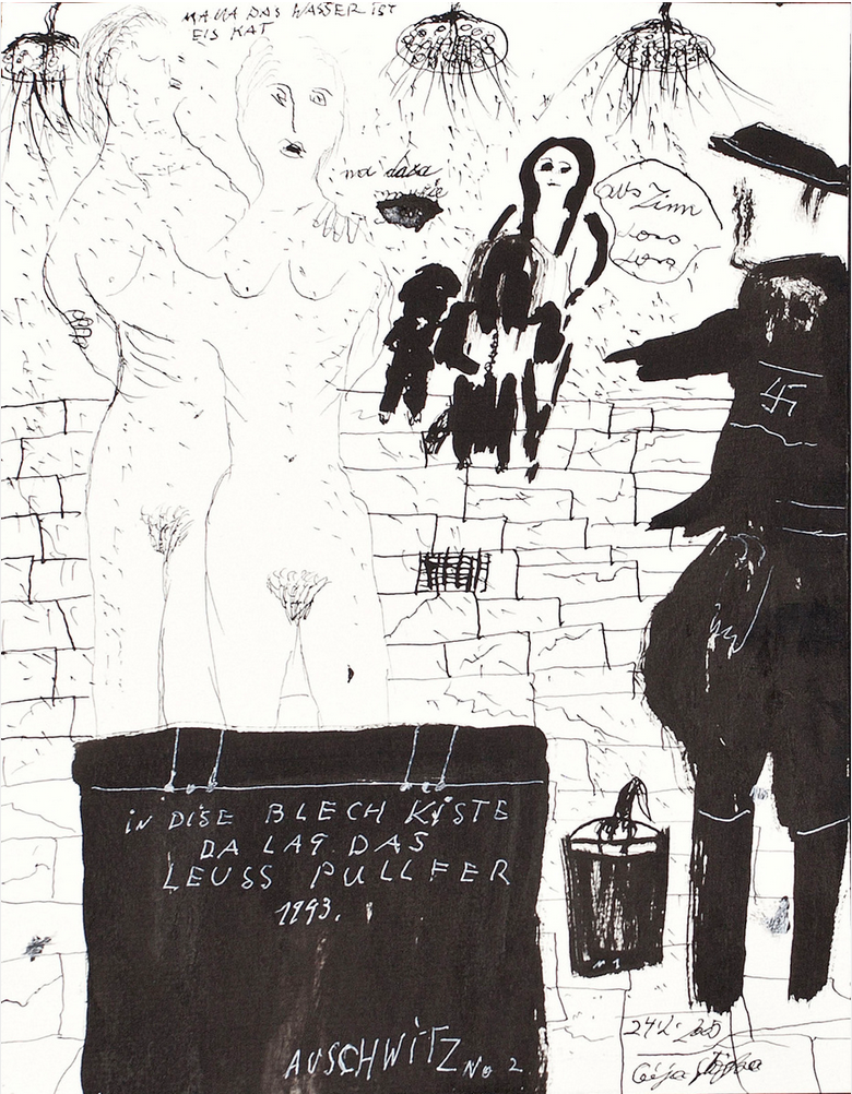 Mama, The Water Is Cold As Ice. Na dara muri [don’t be scared my… (?)]. Get Undressed, Come One, Come On! The Delousing Powder Was In Those Tin Boxes. 1943. Auschwitz. No 2, 24.2.2005, Ink on paper 32 x 24 cm, Hojda and Nuna Stojka collection, Wien