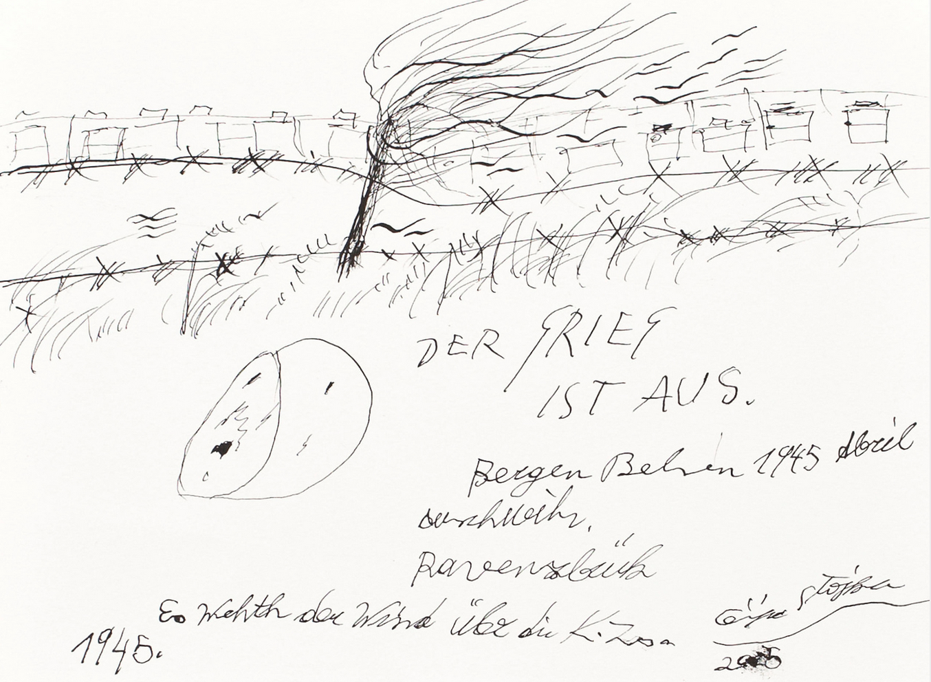 The War Is Over. Bergen-Belsen, 1945, April. Auschwitz, Ravensbrück. The Wind Is Blowing Over The Concentration Camps, 1945, 2005, Ink on paper 24 x 32 cm, Hojda and Nuna Stojka collection, Wien