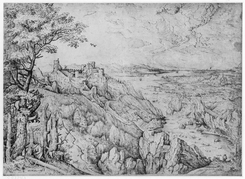 after Pieter Bruegel I; Landscape with St. Jerome; 1556; pen and brown ink; 307 x 418 mm; British Museum Dept. of Prints and Drawings