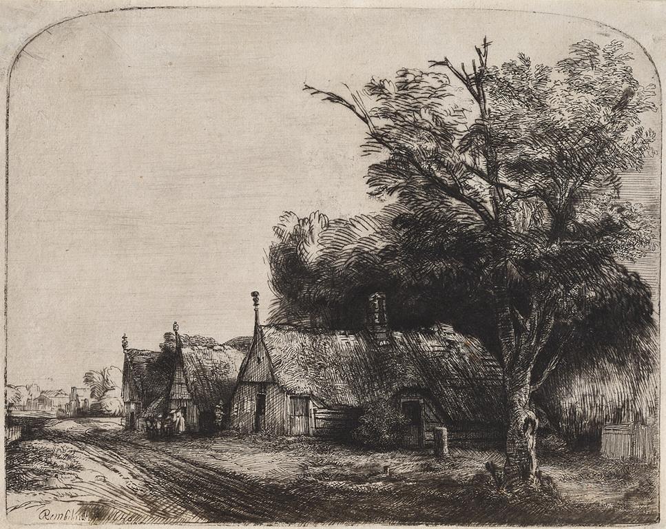 Rembrandt van Rijn; Landscape with Three Gabled Cottages; 1650; black ink on thin European cream-colored antique laid paper; The Frick Collection, New York