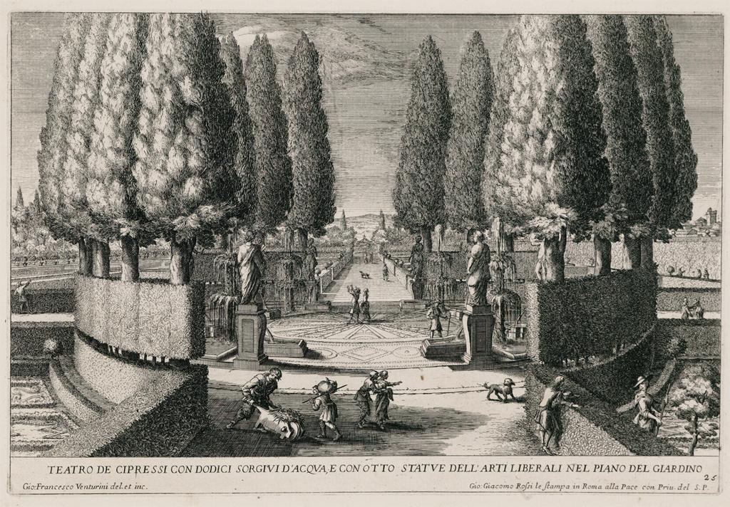 Giovanni Francesco Venturini; Theater of Cypress with Twelve Springs and With Eight Statues of the Liberal Arts in the Lower Garden; 1691; etching; 22.1 x 32.8 cm; Elizabeth Barlow Rogers Collection