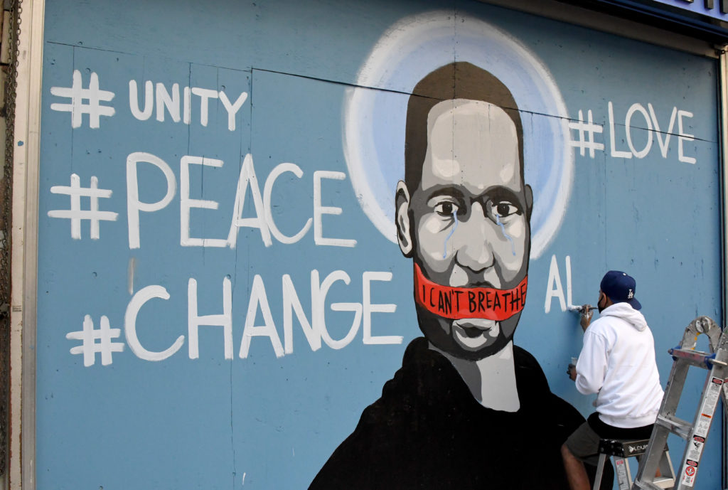 LOS ANGELES, CA – MAY 30: Demonstrators look on as artist Celos paints a mural of George Floyd along Broadway after the death of George Floyd, a black man who was in police custody in Minneapolis during National Day of Protest in Los Angeles on Saturday, May 30, 2020. (Photo by Keith Birmingham/MediaNews Group/Pasadena Star-News via Getty Images)