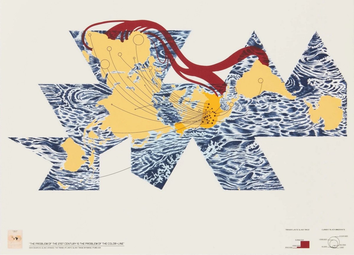William Villalongo and Shraddha Ramani, Black Migration to the U.S. (1/2), 2025. Screenprint with archival pigment print collage, 22 × 28 inches. William Villalongo and Shraddha Ramani, Black Migration to the U.S. (1/2), 2025. Screenprint with archival pigment print collage, 22 × 28 inches.